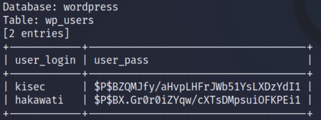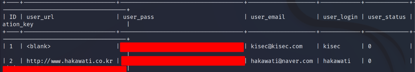 이렇게 유저에 대한 정보를 가져올 수 있었다. 하지만, 관리자의 계정을 알고 싶기에 user에 대한 메타 데이터인 wp_usermeta를 통해 확인해보면 kisec이 관리자인 것을 알 수 있다.