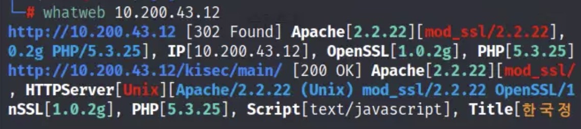 whatweb 10.200.43.12- 이렇게 이미지 보기 쉽게 하기 위해서 옵션을 주지 않았지만, 더욱 자세히 보기 위해서는