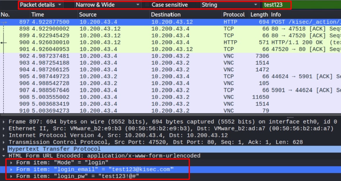 수도 없이 많은 패킷이 잡혔다. Ctrl + F(Find Packet), Packet details, String 옵션을 적용하고 로그인에 사용된 아이디를 검색해보겠습니다.
