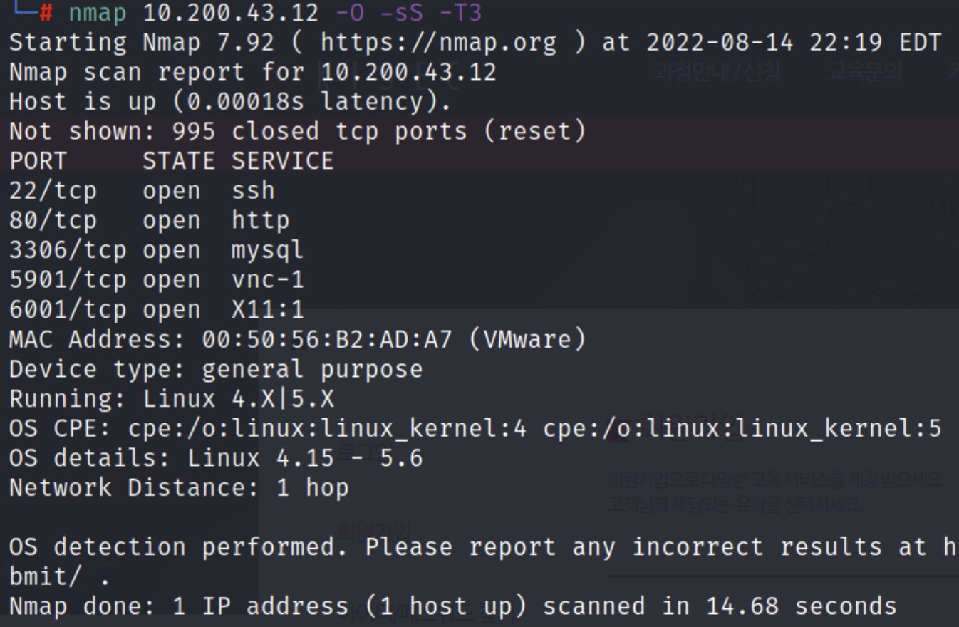 nmap 10.200.43.12 -O -sS -T3- 어떤 포트를 열고 어떠한 서비스를 사용하고 있는지 알 수 있다.