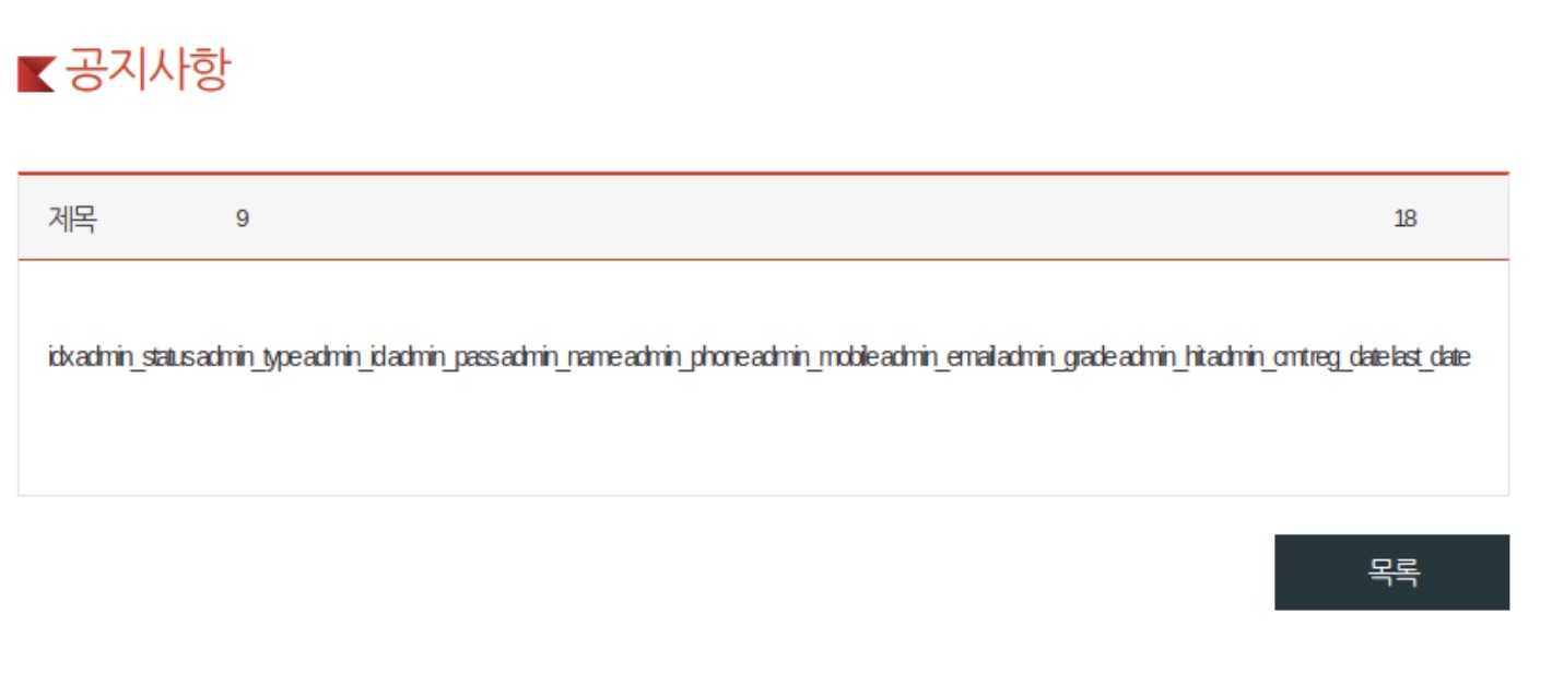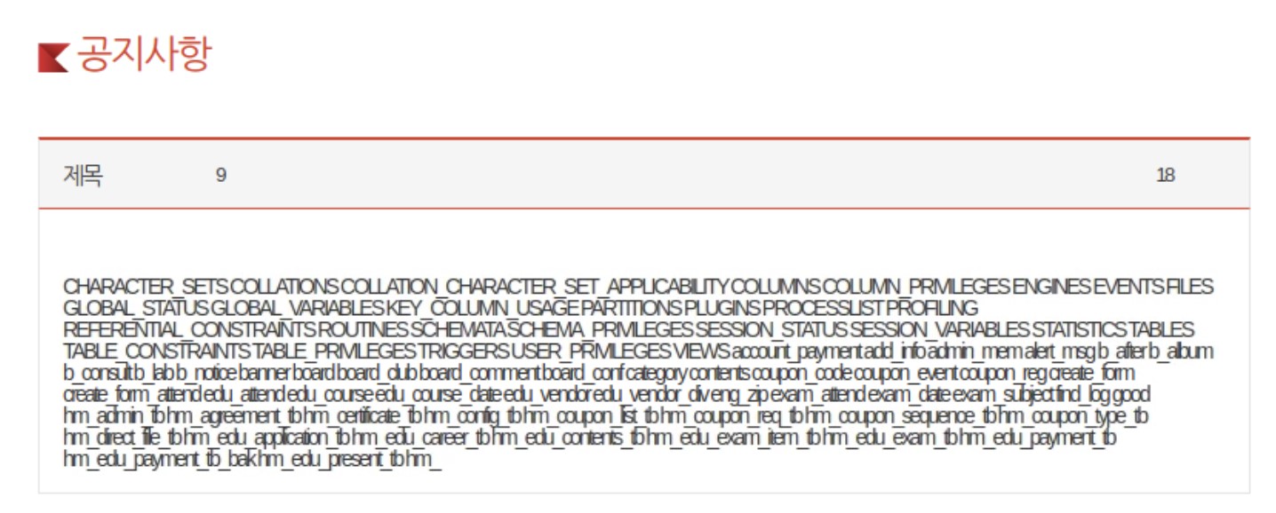 데이터베이스의 주요 정보가 노출되지 않았지만, 이처럼 쿼리자체에 문제가 있다고 노출시키는 것만으로 타 공격자에 의해 무차별적 공격이 이루어질 수 있다.