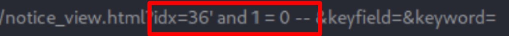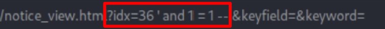 and 1=1 -- 를 추가하였을 때, 만약 응답 기반의 취약점이 존재한다면 and 이후 문장의 참 / 거짓 여부에 따라 정상 / 에러 페이지가 결정된다.