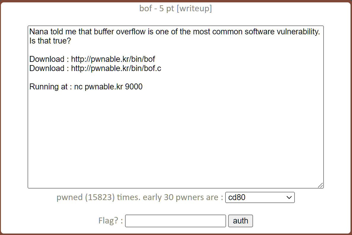 나나가 가장 흔한 소프트웨어 취약점은 bof라는데 정말이냐고 물어보네요. 이번 문제를 bof로 풀어보라는 것 같습니다!