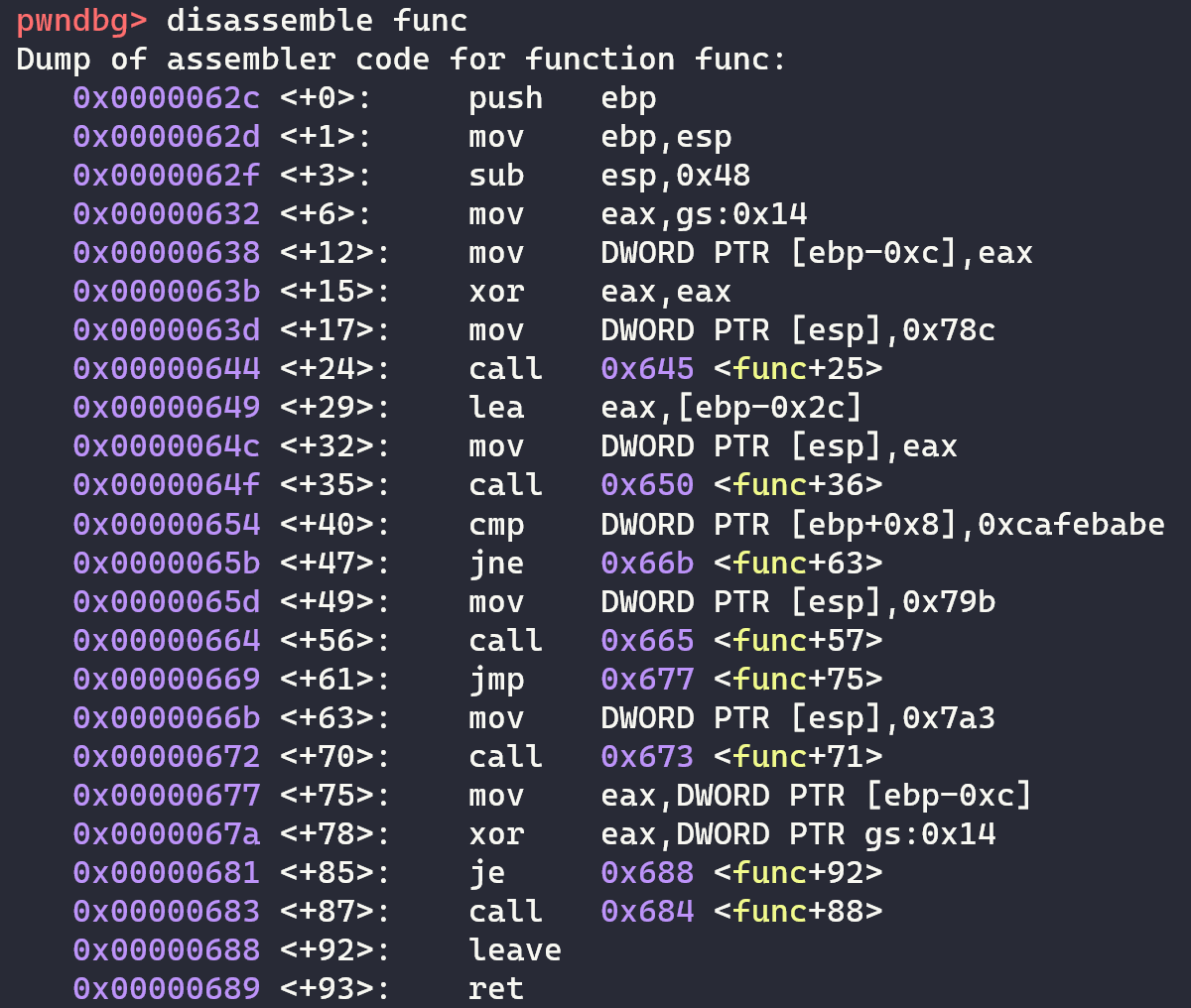 Canaries 또는 Canary word는 버퍼 오버 플로우를 모니터하기 위해 버퍼와 제어 데이터 사이에 설정 된 값이다. 버퍼 오버플로가 발생하면 Canary 값이 손상되며, Canaries 데이터의 검증에 실패하여, 오버플로에 대한 경고가 출력되고, 손상된 데이터를 무효화 처리한다. 위 어셈블리어의 func+6을 보면 gs:0x14가 CANARY이다. eax에 CANARY RANDOM값을 넣어 버퍼 오버플로시 변경되었을 때 위 값을 비교하여 무효화 처리 하는 것이다. -