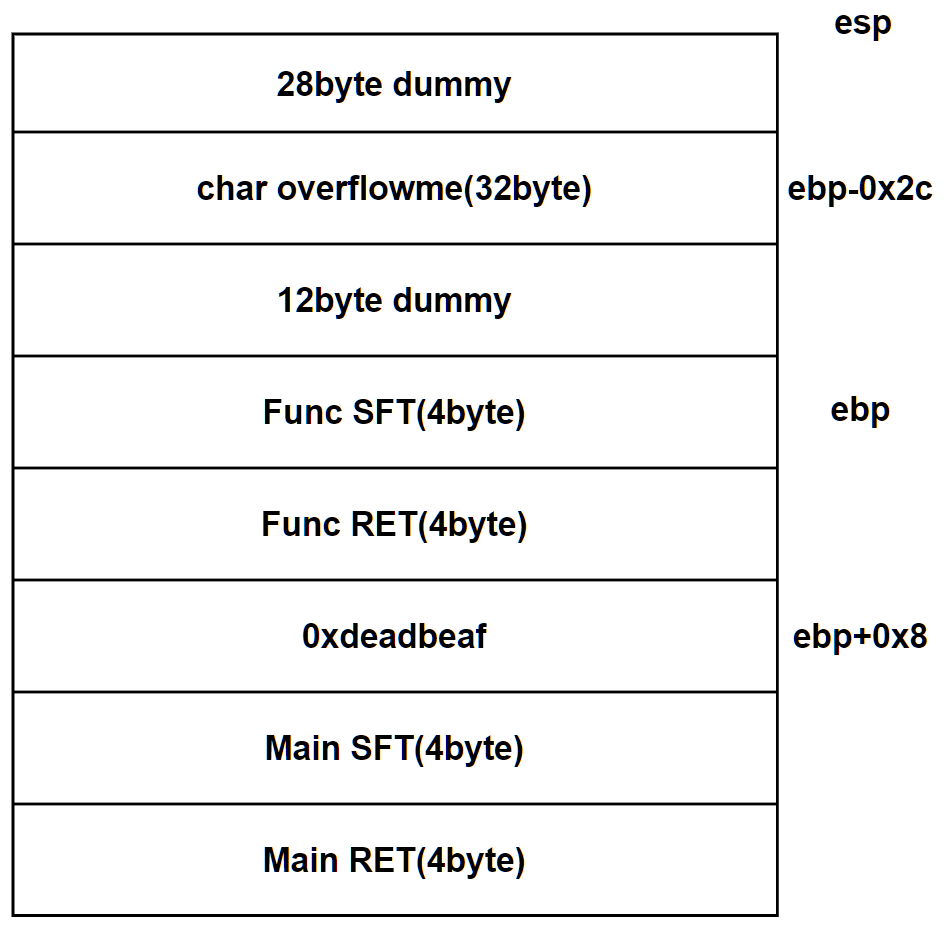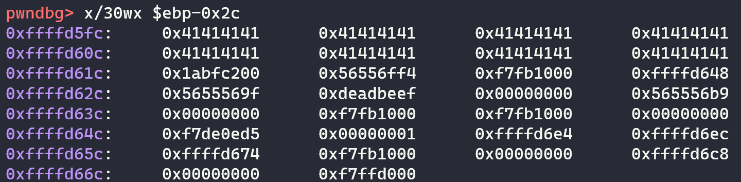- func+40에 break point를 걸고 위 코드를 사용하면 실제로 32개의 A가 적재되고 0xdeadbeaf가 있는 것을 확인할 수 있다.