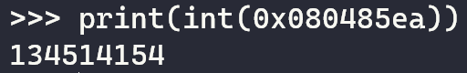scanf("%d", passcode1);에서 10진수로 받으므로, 0x080485ea를 10진수로 바꾸면 134514147이다.