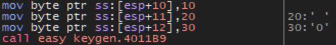 [esp+10], [esp+20], [esp+30]에 각각 10, 20, 30의 값을 넣는 것을 알 수 있고,easy keygen.4011B9는 Input Name :을 출력하는 함수 호출임을 알 수 있다.