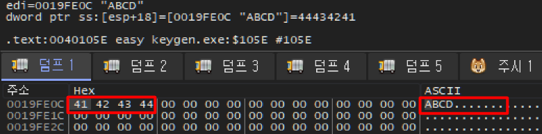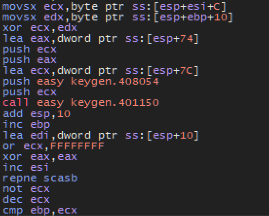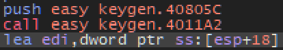 call esay keygen.4011B9를 통해 실질적인 Name을 입력 받고, 그 값을ss:[esp+18]에 저장하는 것을 알 수 있다.