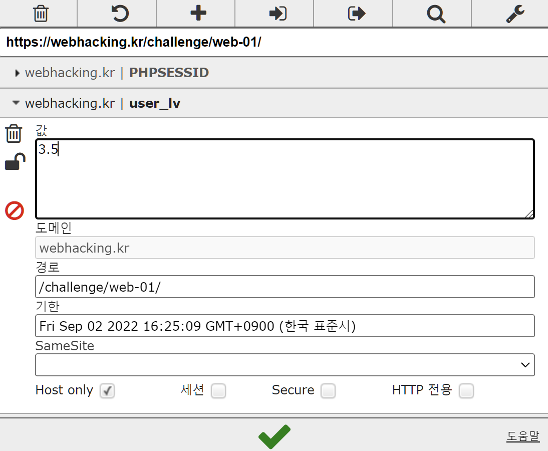 크롬의 확장 프로그램인 ‘EditThisCookie’으로 쿠키 값을 변경 할 수 있다.