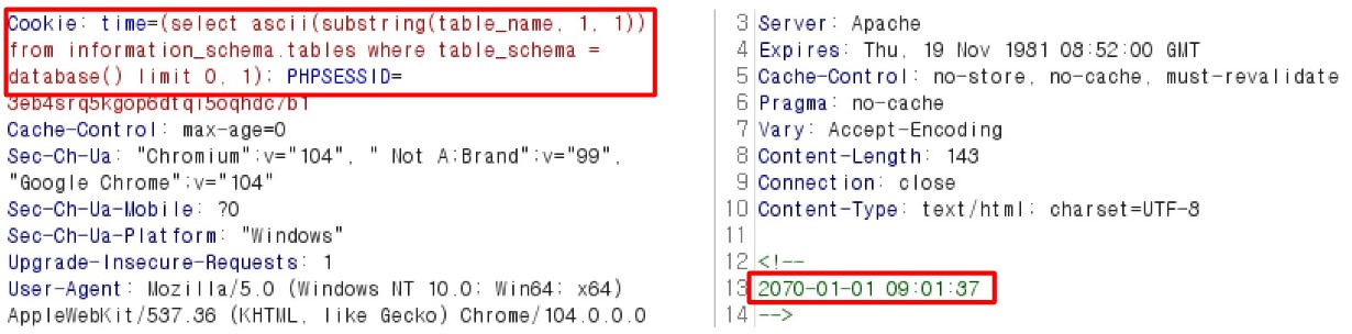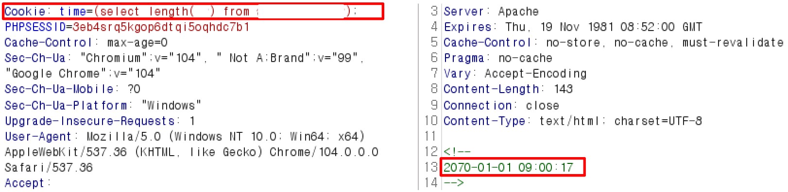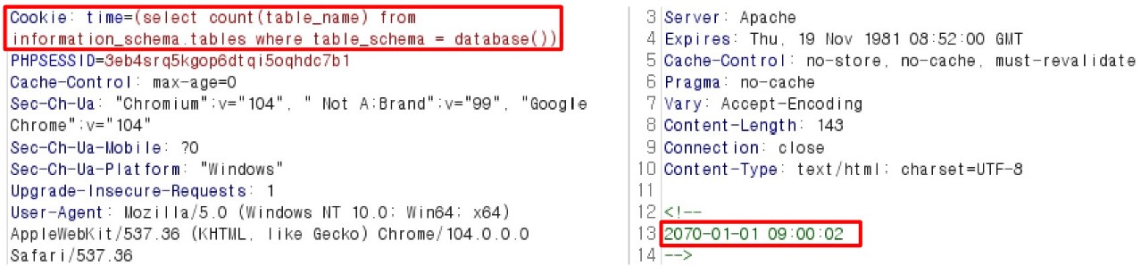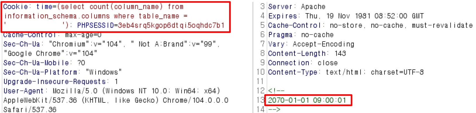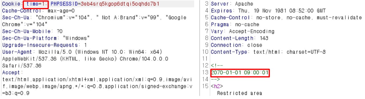 Burp Suite로 Cookie의 Time 값을 ‘1’로 변경했을 때 주석의 시간이 2070-01-01 09:00:01로 변경하는 것을 확인했다.