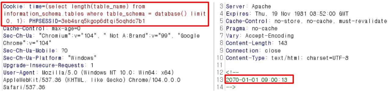 그렇다면, 이제 각 테이블의 이름 길이를 확인한 후 출력하는 방식이 시간으로 나오므로 한 글자씩 아스키코드로 출력하여 값을 확인하면 될 것으로 보인다.