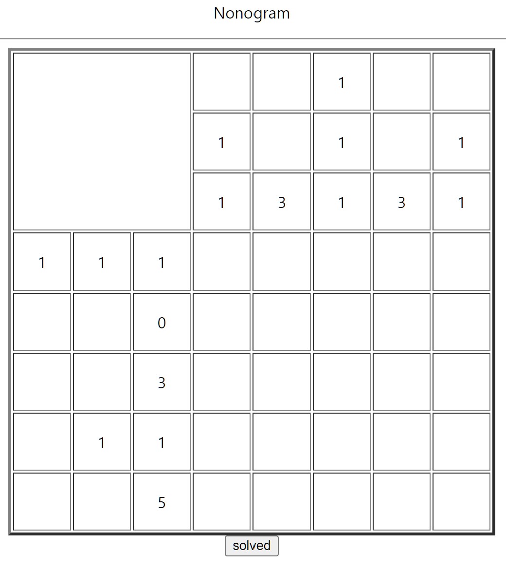 들어가면 이러한 것이 나오는데 소스코드를 봐도 이거를 제외하고는 아무것도 없다. 그래서 노노그램이라는 퍼즐게임을 일단 풀어봤다.