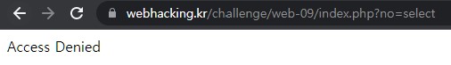 https://webhacking.kr/challenge/web-09/index.php?no=4 paramter인 no을 4로 입력했을 때와 '(싱글 쿼테이션), SELECT, FROM, UNION 처럼 SQL에 들어갈 모든 구문이 필터링되는 것을 알 수 있다.