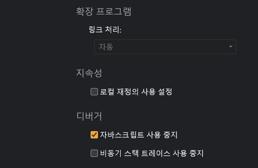 Chrome에서는 [디버거 - 자바스크립트 사용 중지]를 지원한다.